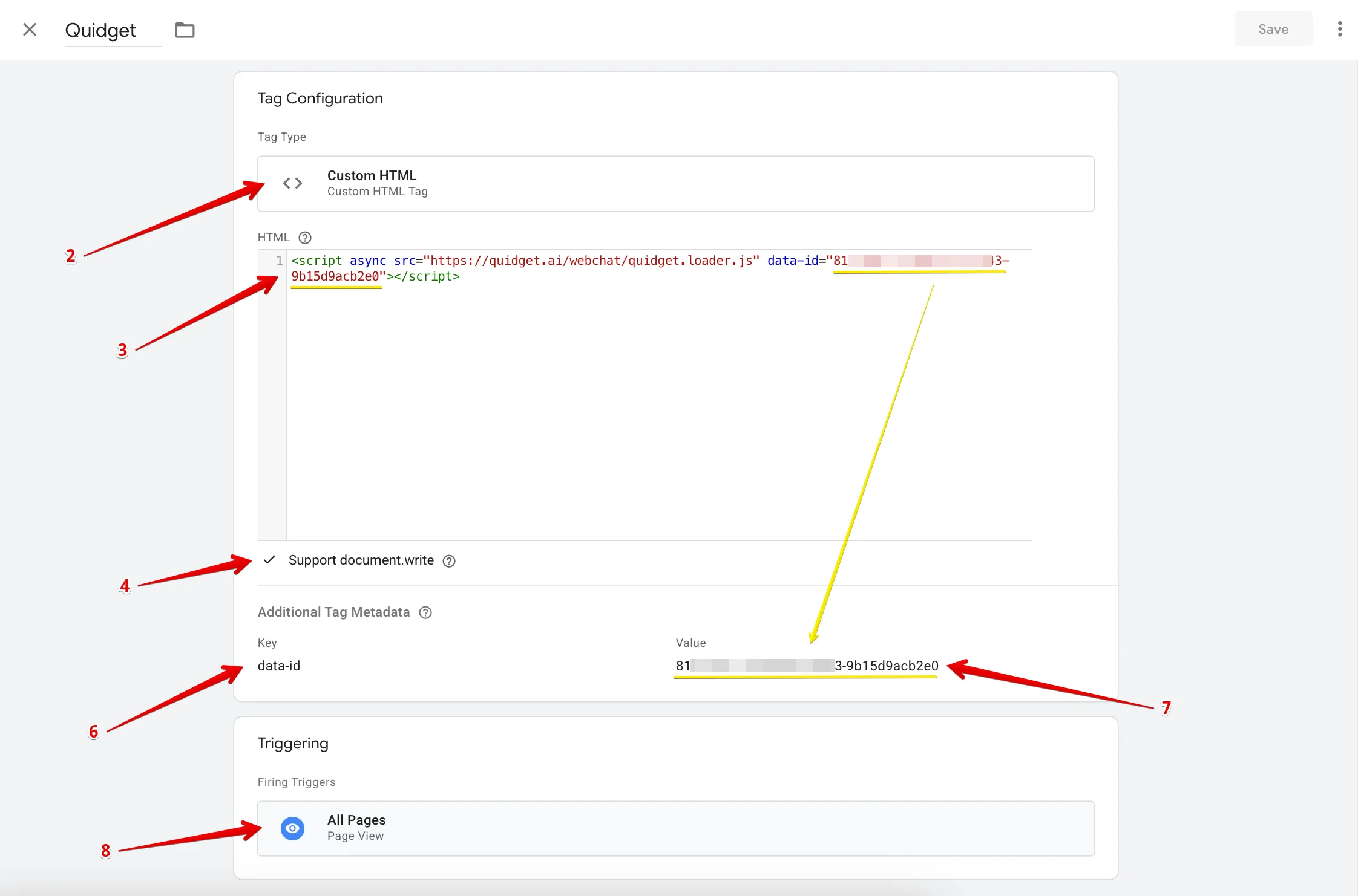 Log in to your Quidget account and go to Test & Install. Copy the installation code provided.